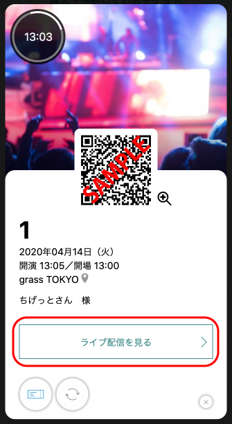 ・開場時間になると、参加者のチケットに表示された「ライブ配信を見る」が押せるようになります。こちらを押すとライブ配信ページが開きます。